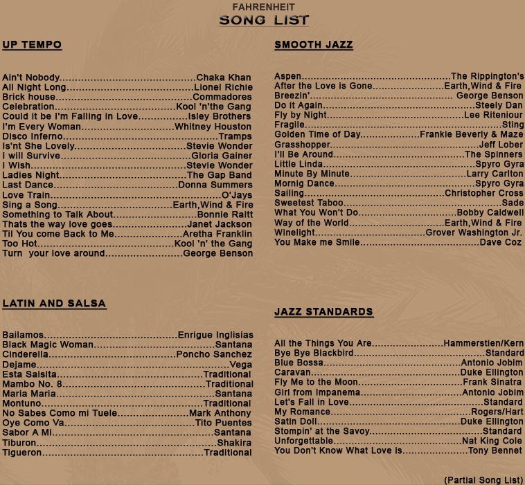 Fahrenheit has been Houston’s Jazz source since 1991. Their 5‐piece band (bass, drums, guitar, keyboard, and saxophone), a combination of Smooth Jazz, Funk, Latin Jazz, World Beat, and R&B, blended with high energy and silky elements make for an exciting and unforgettable performance.